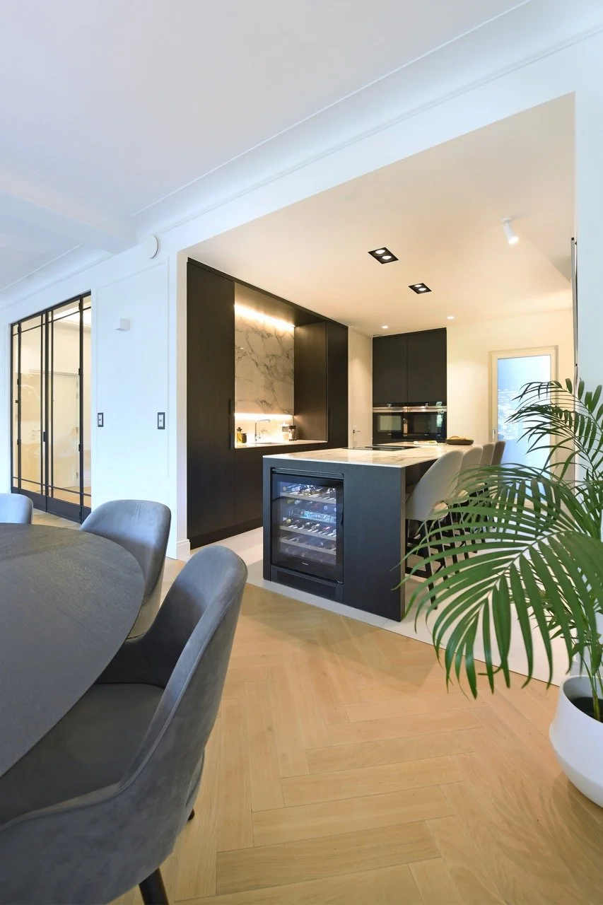 Het eindresultaat is een evenwichtige combinatie van art-deco-invloeden en hedendaagse ingrepen, waarbij authenticiteit en comfort elkaar versterken. Een interieur waarin proportie, materialiteit en detail samenkomen in een ingetogen, maar uitgesproken geheel.