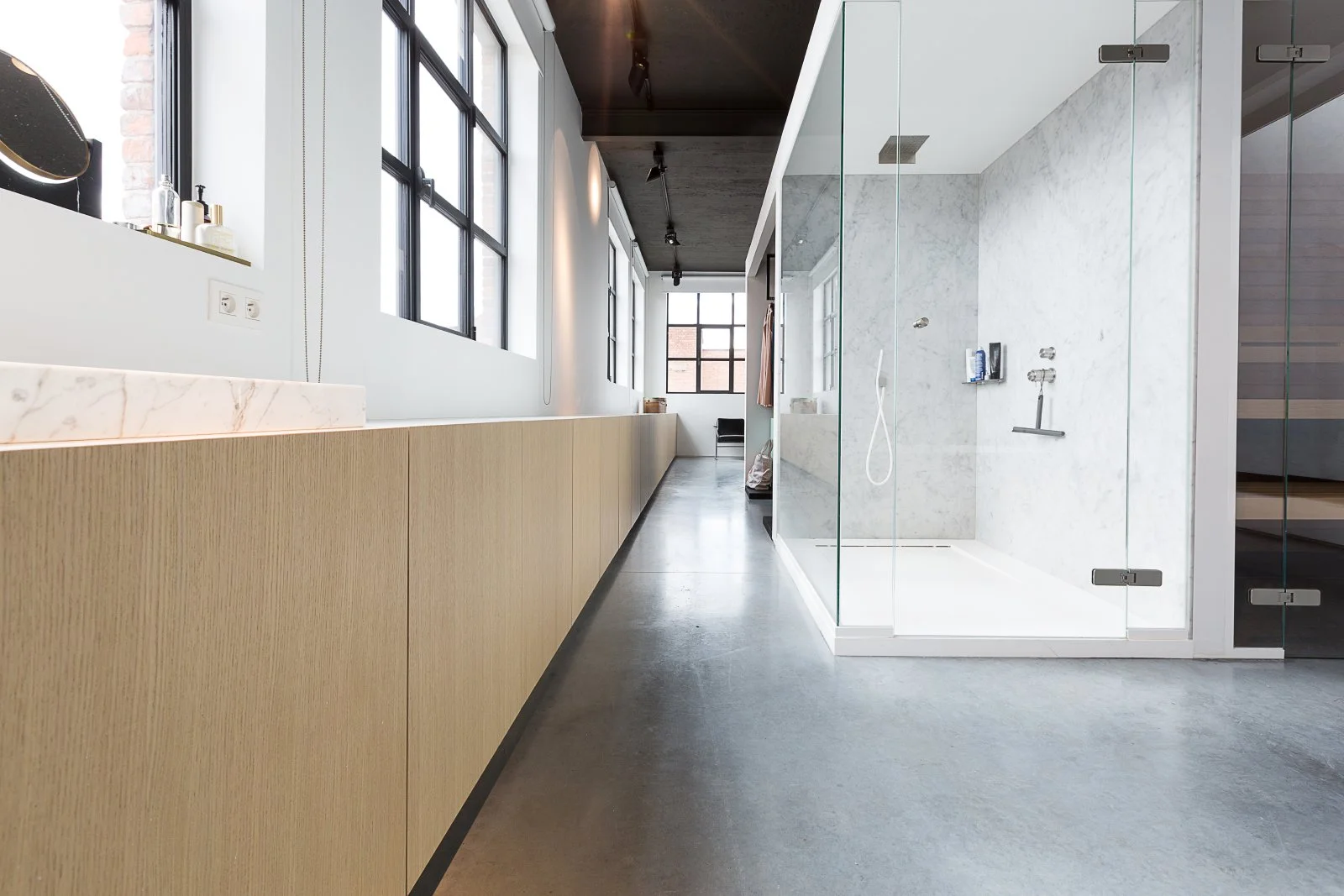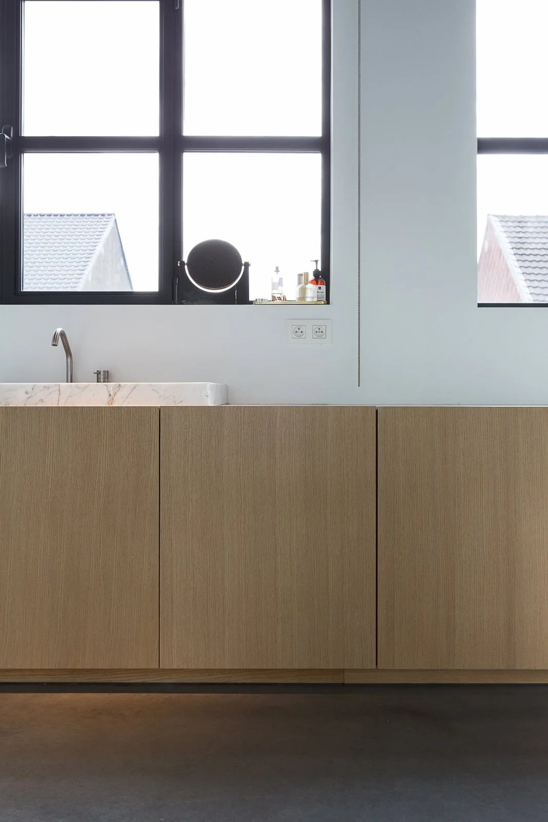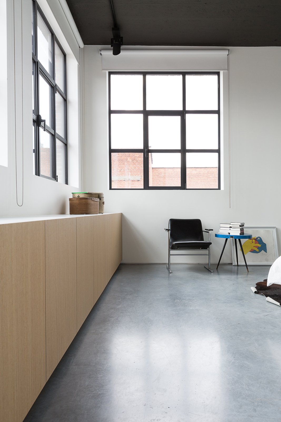 De kastfronten van warm eiken hout contrasteren met de betonnen vloer en authentieke fabrieksramen.