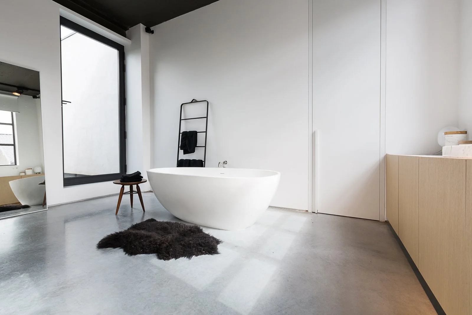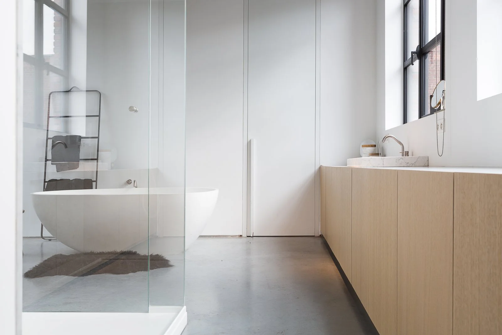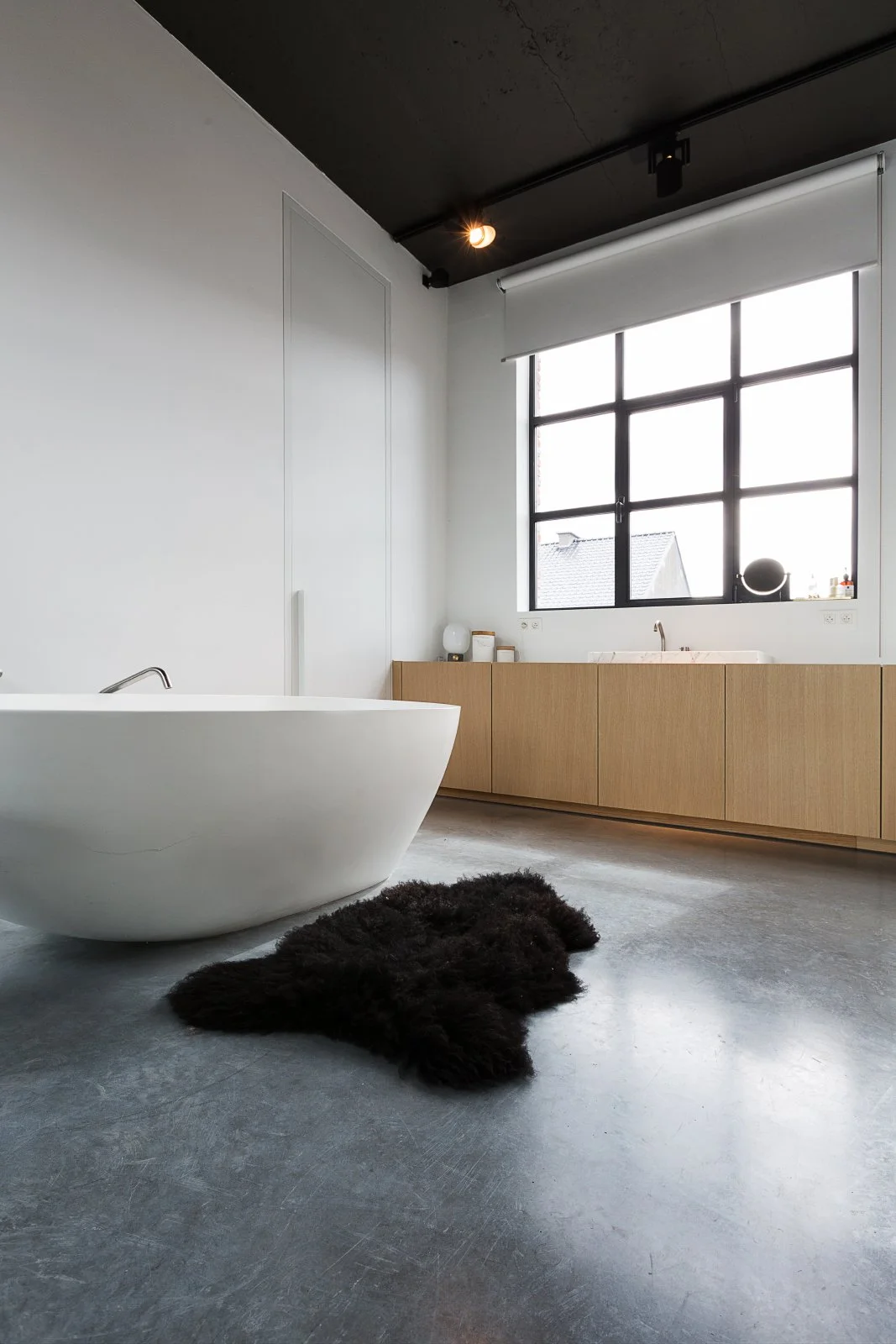 De kastfronten van warm eiken hout contrasteren met de betonnen vloer en authentieke fabrieksramen.
