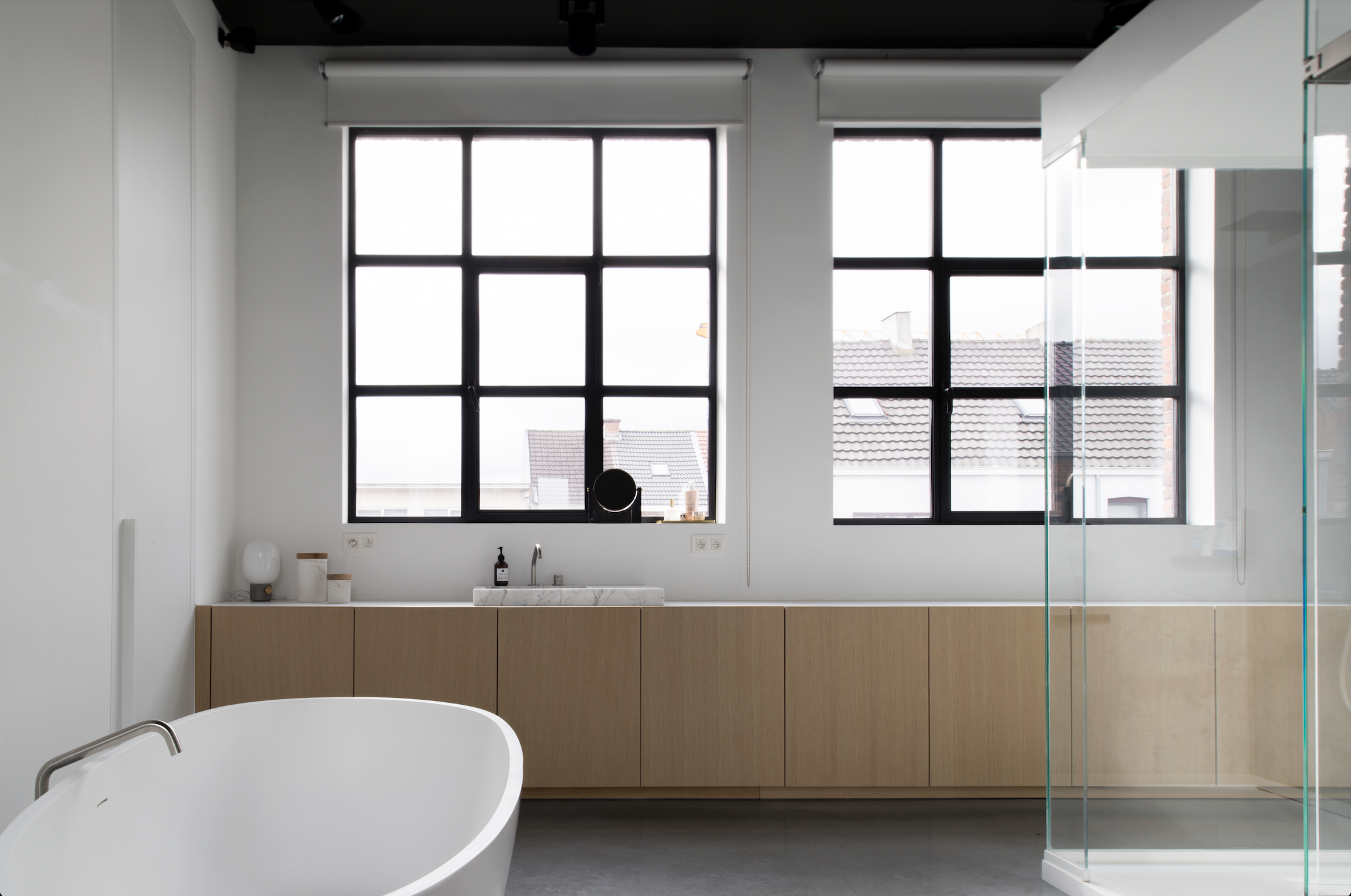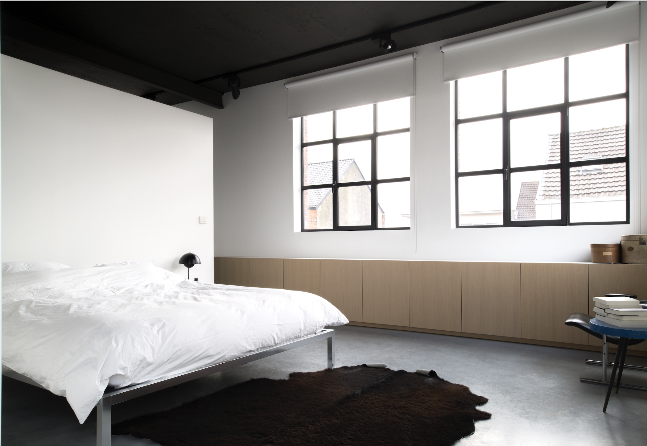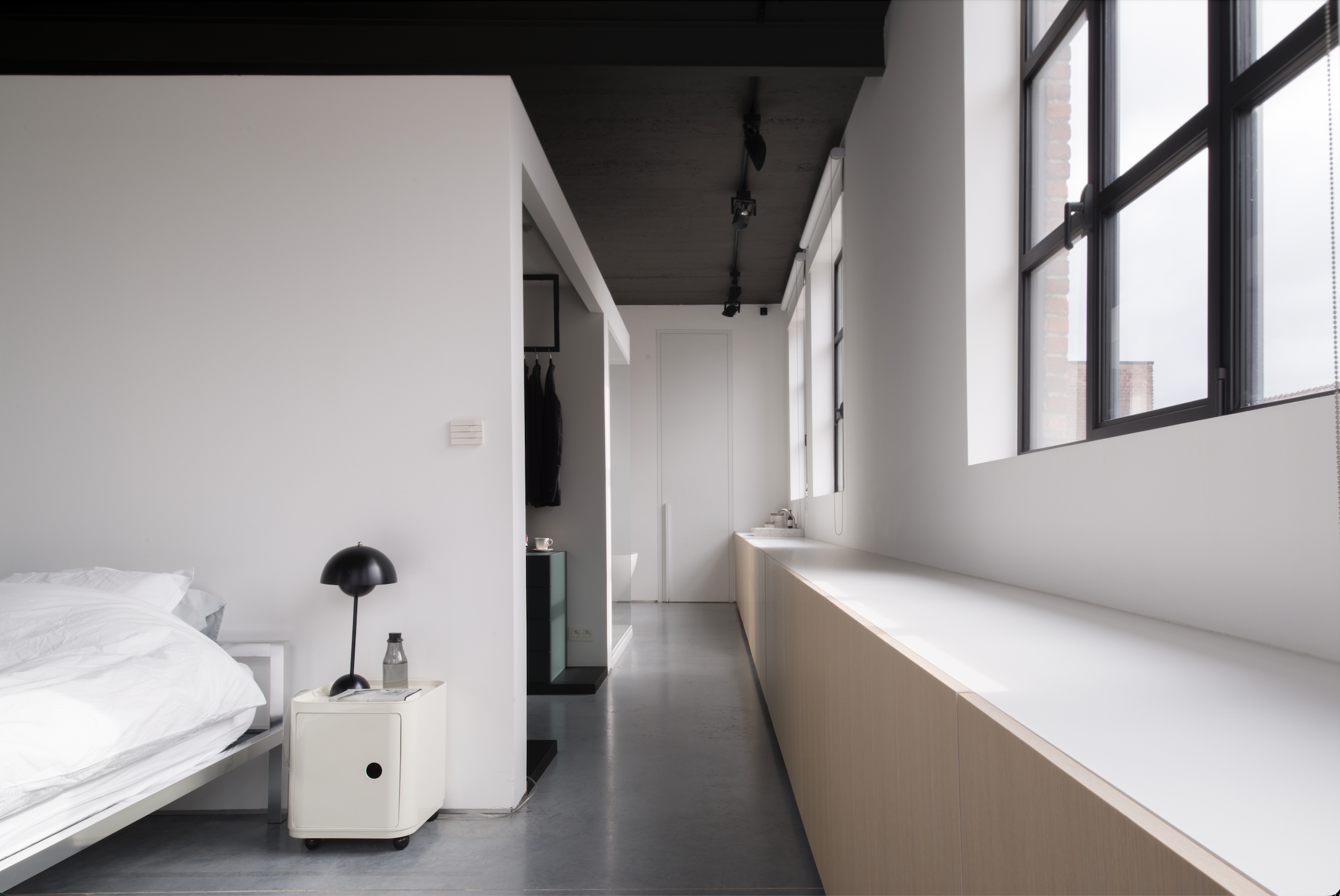 De kastfronten in warm eikenhout vormen een krachtig contrast met de betonnen vloer en de authentieke fabrieksramen. Over een lengte van 11 meter verbindt deze maatwerk kastenwand de master bedroom met de open dressing en de badkamer-wellness.